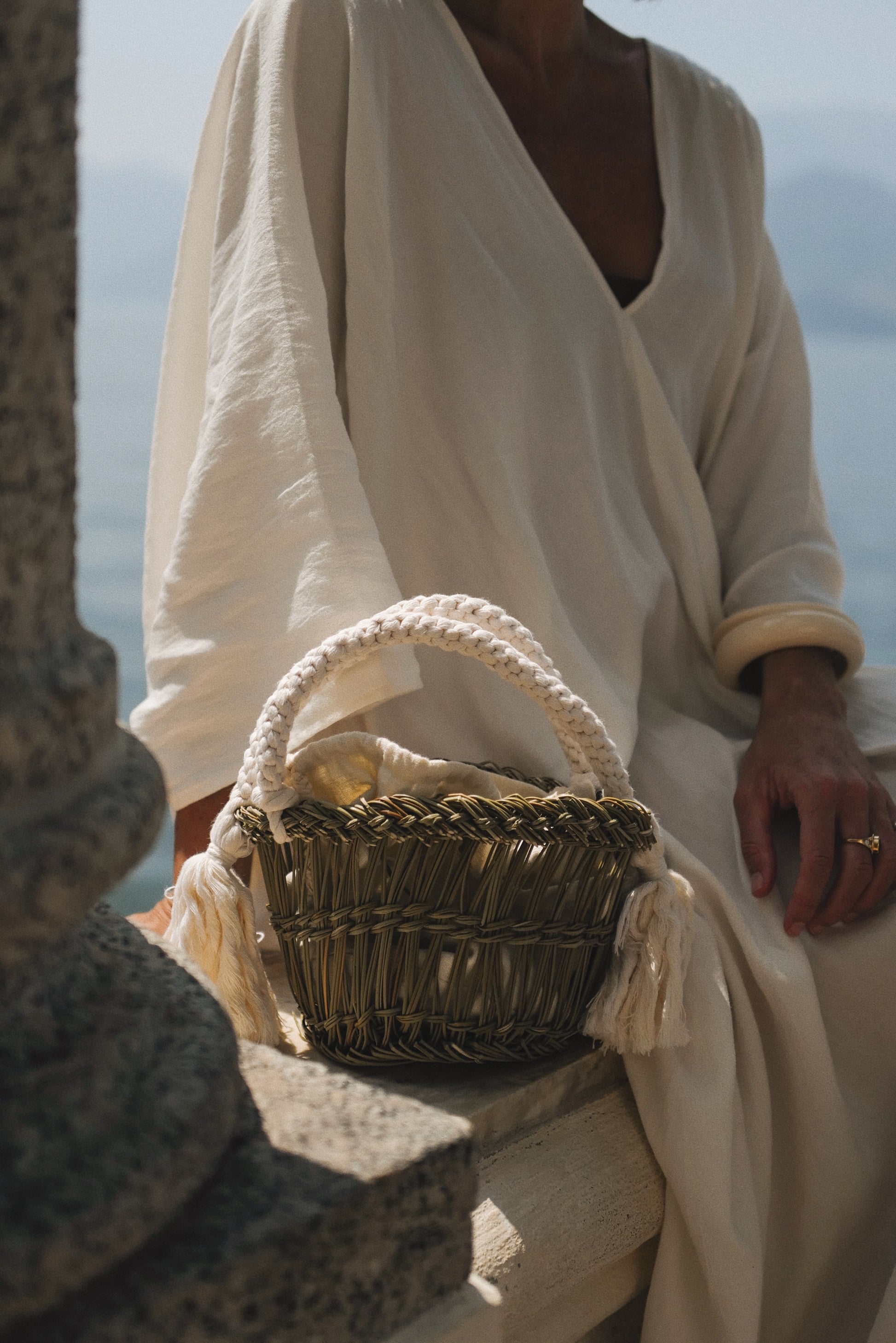 The GREYMINT Basket Bag, crafted from the Juncus plant used in traditional Greek tirovoli cheese baskets, made in Paros island, blends rich history and timeless craftsmanship. Woven with techniques passed down through generations, each bag embodies unique character and durability.