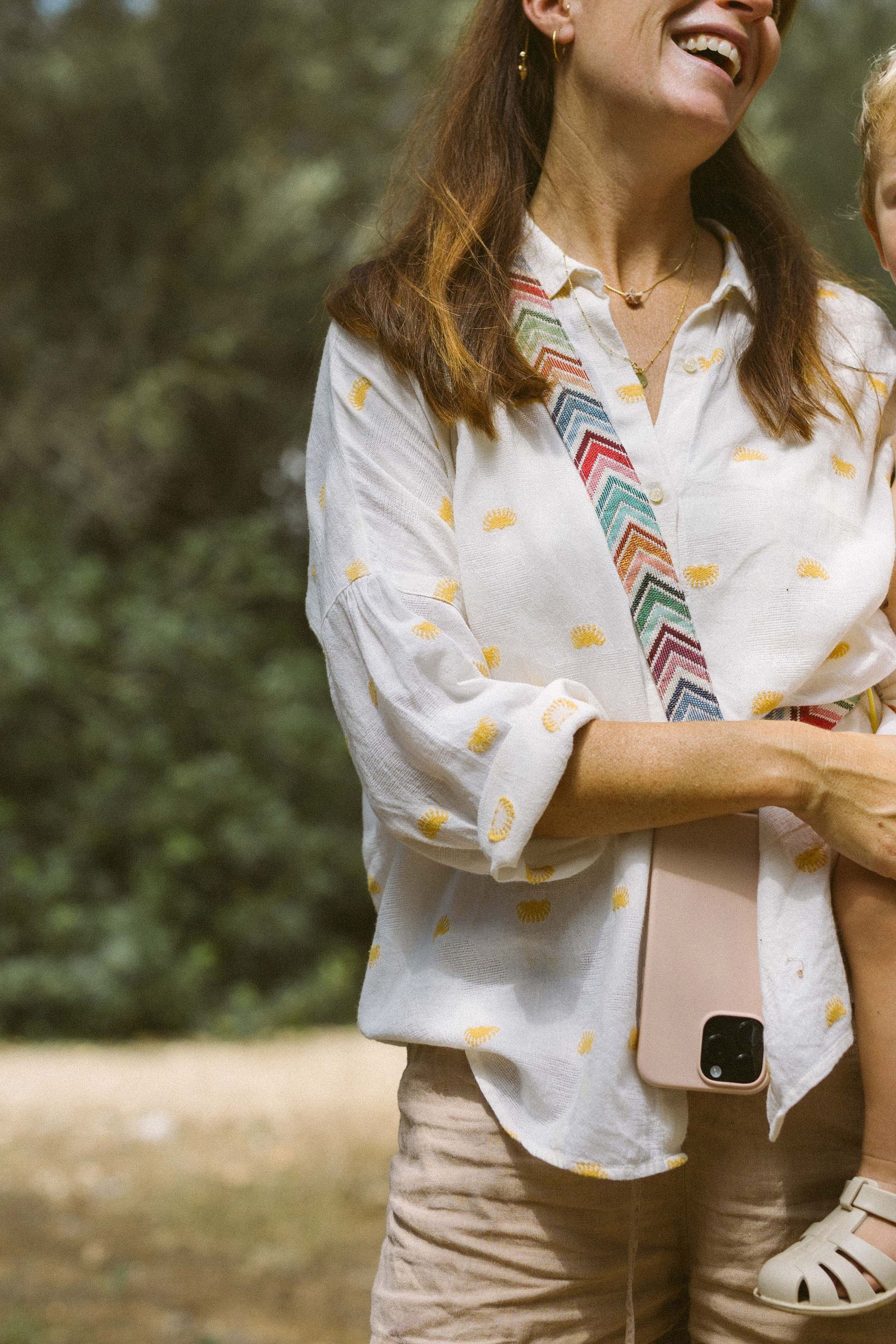 Inspired by the vibrant, colourful landscapes and the vivid green and pink flowers of Formentera, this phone strap embodies the island's spirit. Crafted and handmade from recycled materials, it aims to bring the warm sunset hues and the aroma of sunscreen into your days year-round.